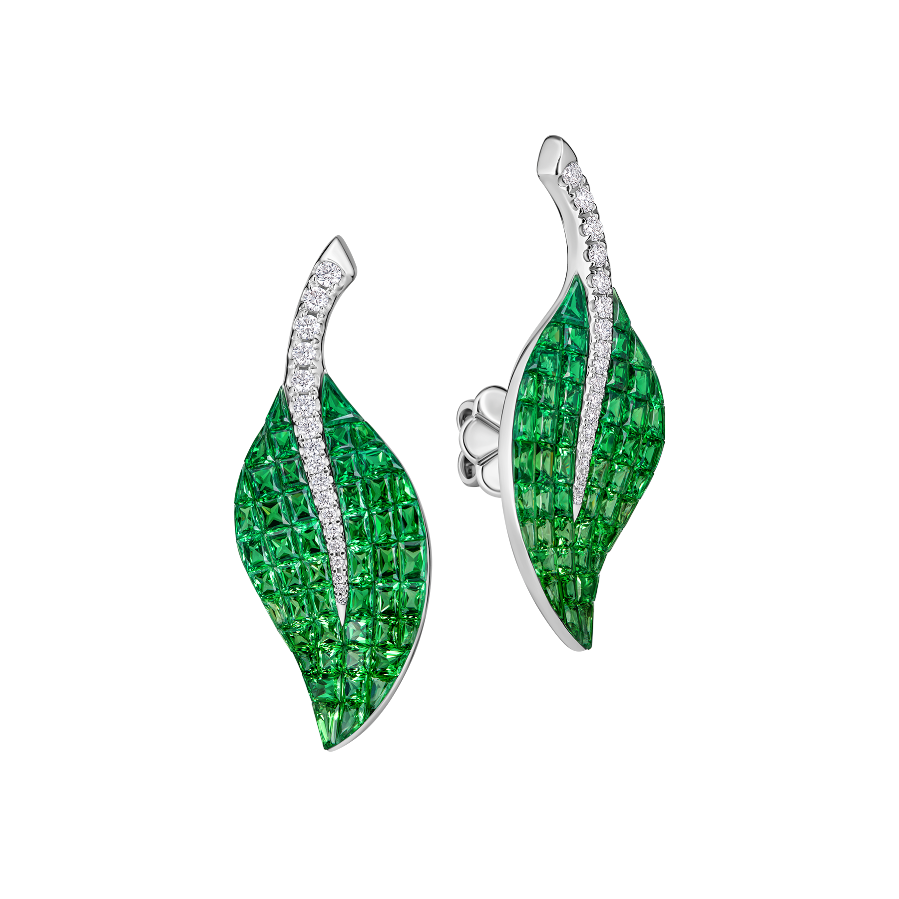 В коллекции INVISIBLE INLAY ювелирного дома CHAMOVSKIKH тема природы является главенствующей. Изящные пусеты-листья инкрустированы 100 ярко-зелеными тсаворитами и 35 сияющими бриллиантами. Благодаря «невидимой» фиксации драгоценных камней, форма украшения выглядит максимально реалистичной, а драгоценных искр становится многократно больше.