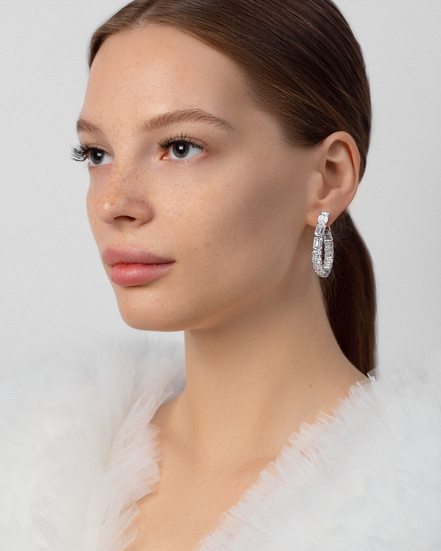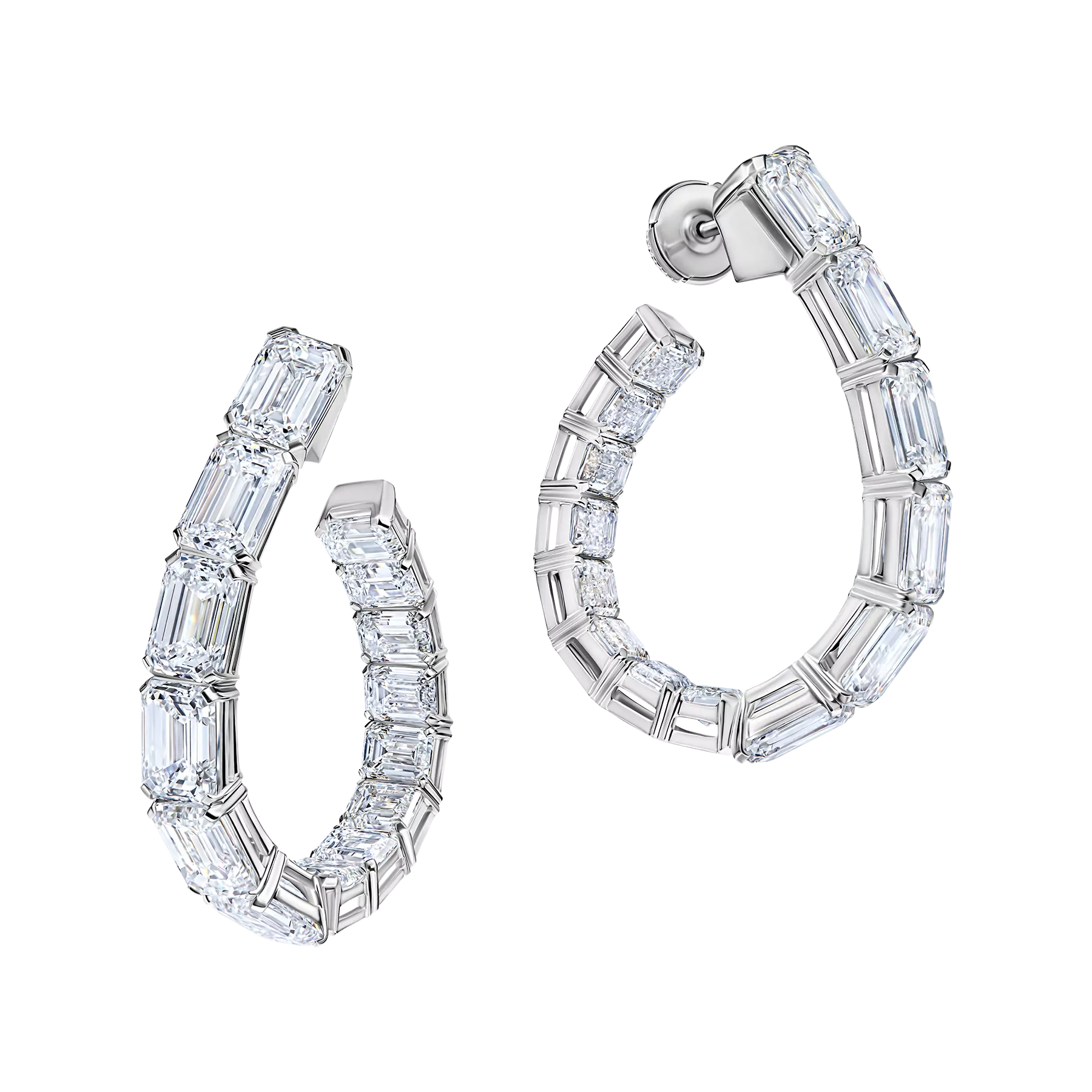 Композиционное решение драгоценных пусет из коллекции Classic вдохновлено поистине роскошным сиянием 28-и бриллиантов безупречной огранки Emerald общим весом более 26 ct. Благодаря сложной и невероятно эффектной архитектуре, каждый драгоценный камень предстает во всем великолепии и максимально открыт для восхищенных взглядов. Эти пусеты — эталон новой классики — станут ярким акцентом делового аутфита и украшением самых значительных светских событий.