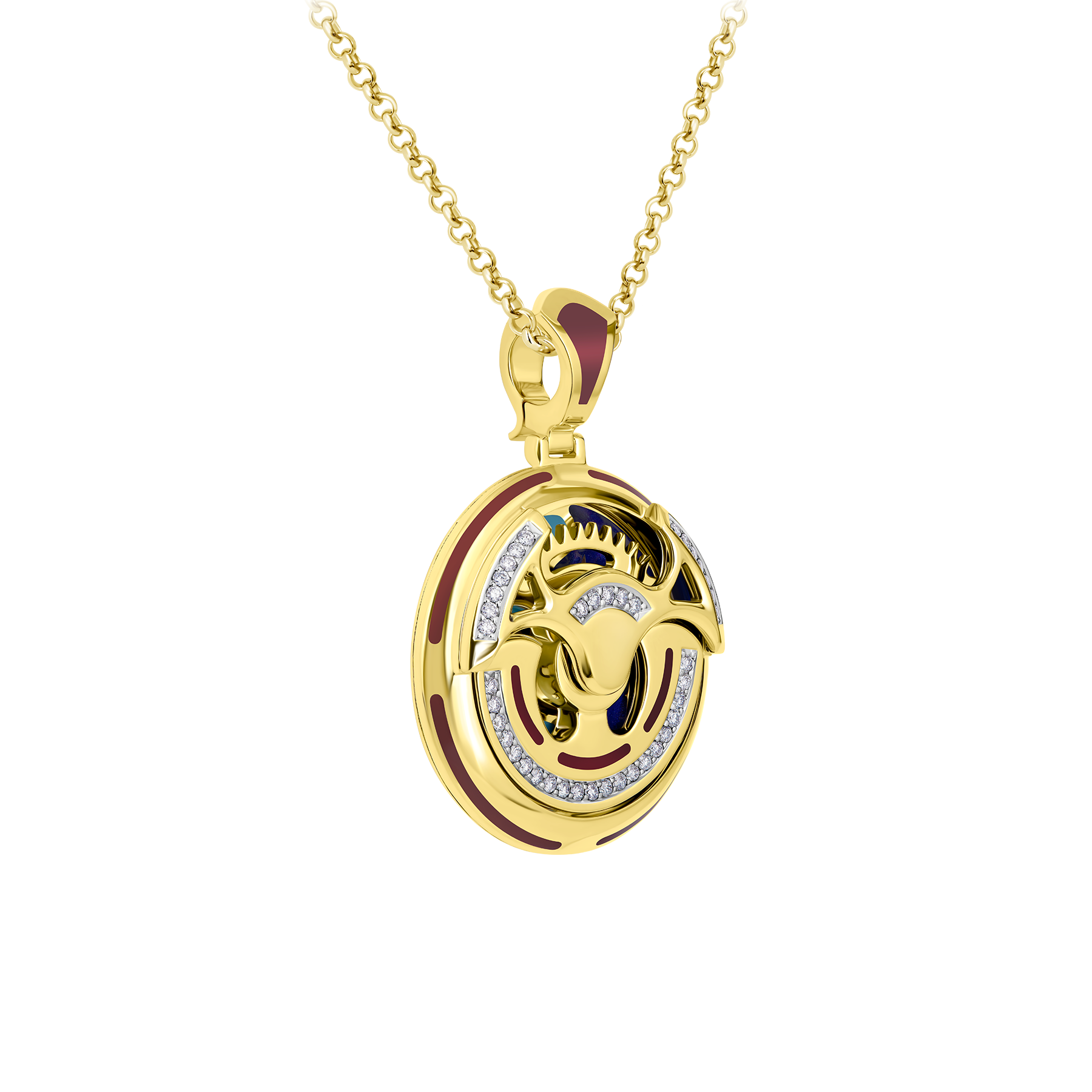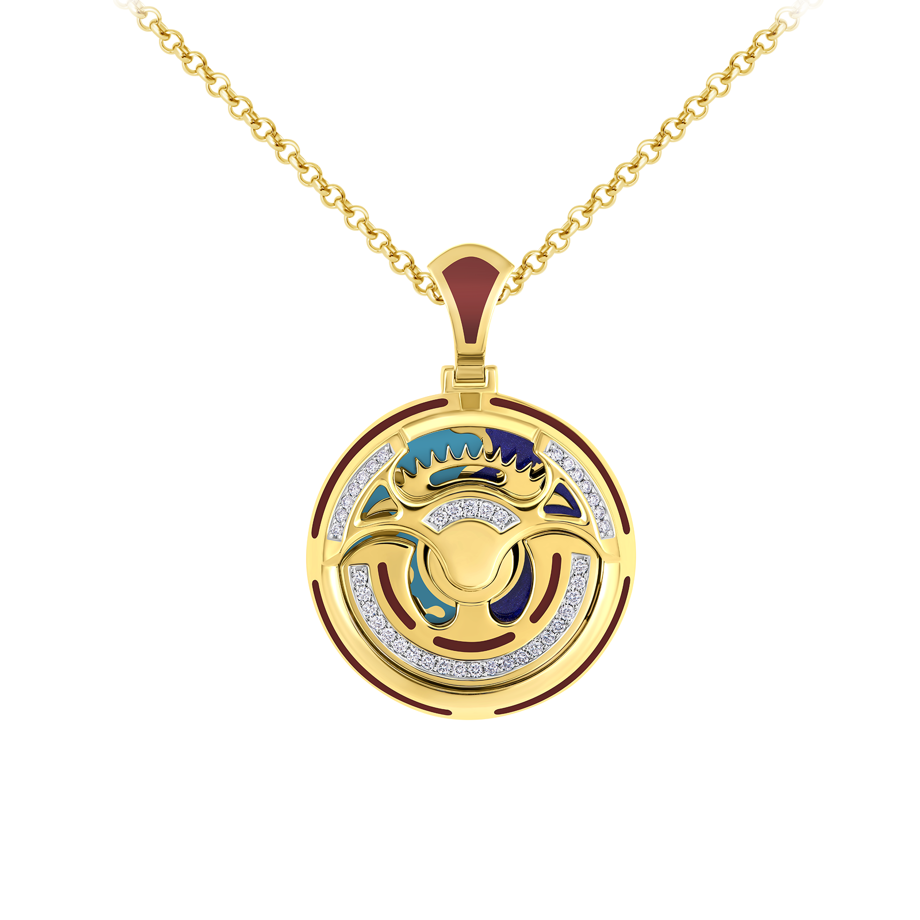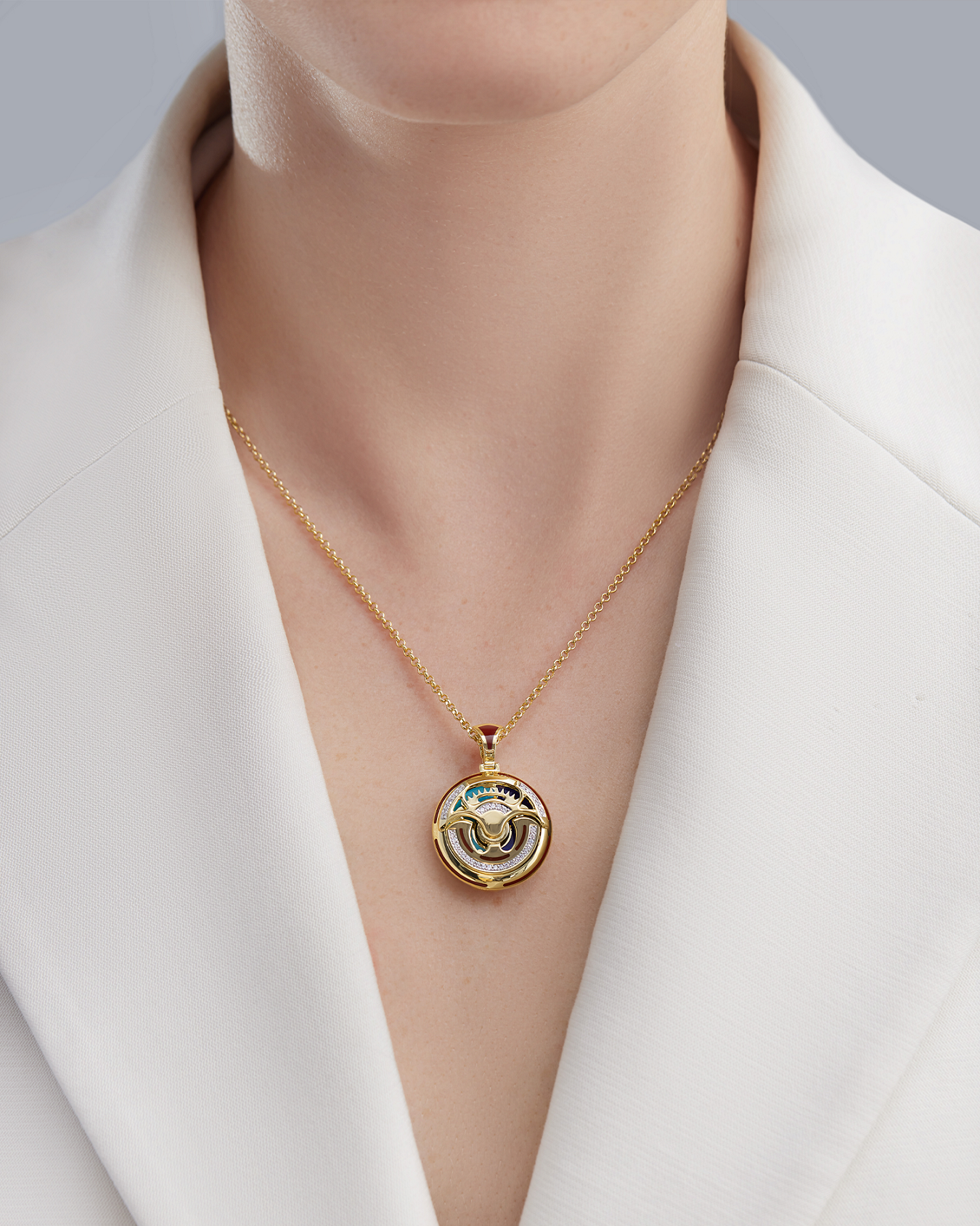 В подвесе Motion 40 бриллиантов сочетаются с ярким орнаментом из желтого золота, алой, бирюзовой и синей керамической эмалью. В подвижных украшениях капсульной коллекции отражен бесценный опыт ювелиров, непревзойденное мастерство, эстетика и технические новации.