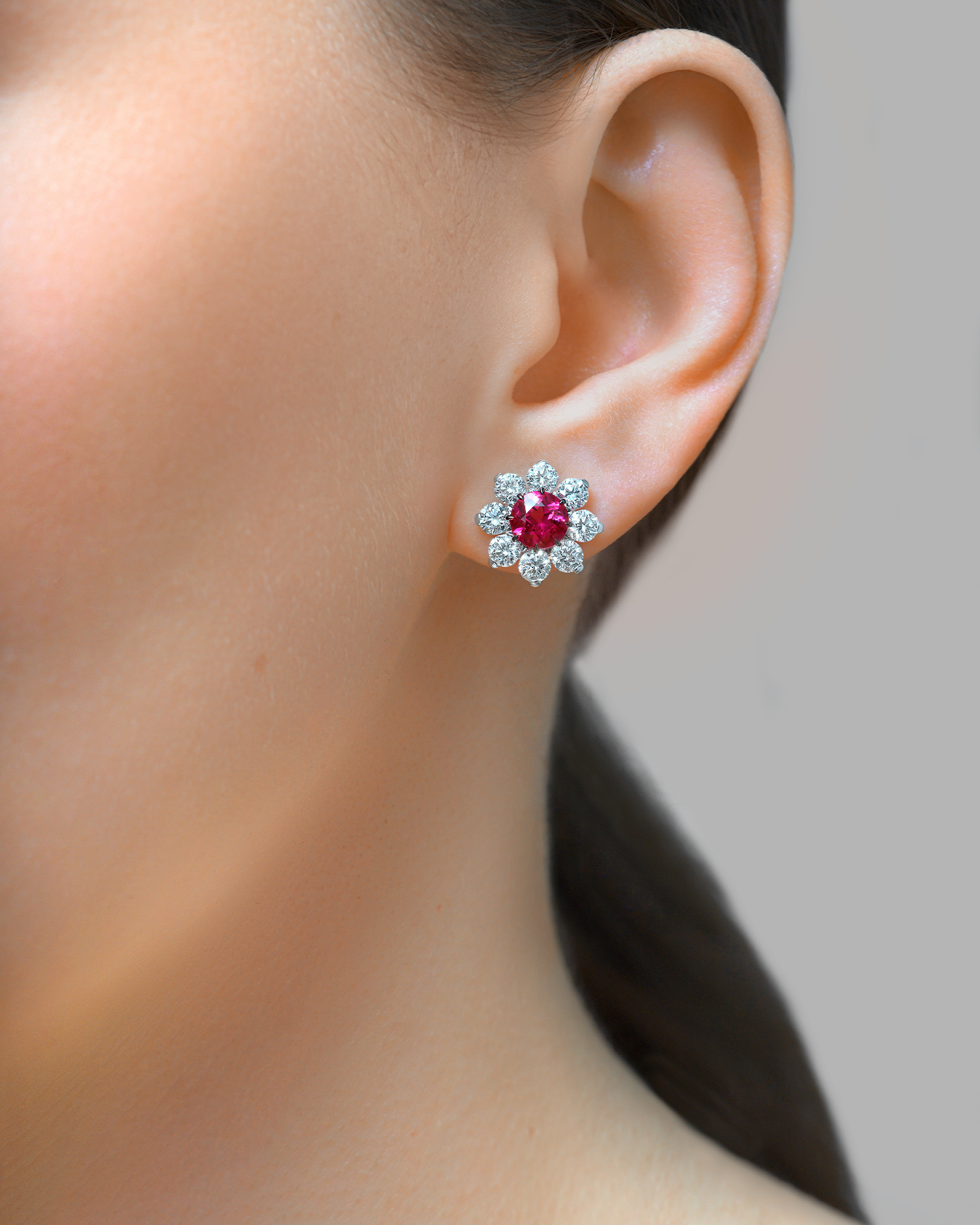 Пусеты с флористическими мотивами — изысканное украшение, в котором два турмалина рубеллита весом 1,58 ct, сверкают яркими алыми оттенками. Инкрустация из 16 бриллиантов подчеркивает красоту центральных самоцветов. Комфортная и надежная застежка обеспечивает удобство ношения, делая пусеты идеальным выбором для любого случая.