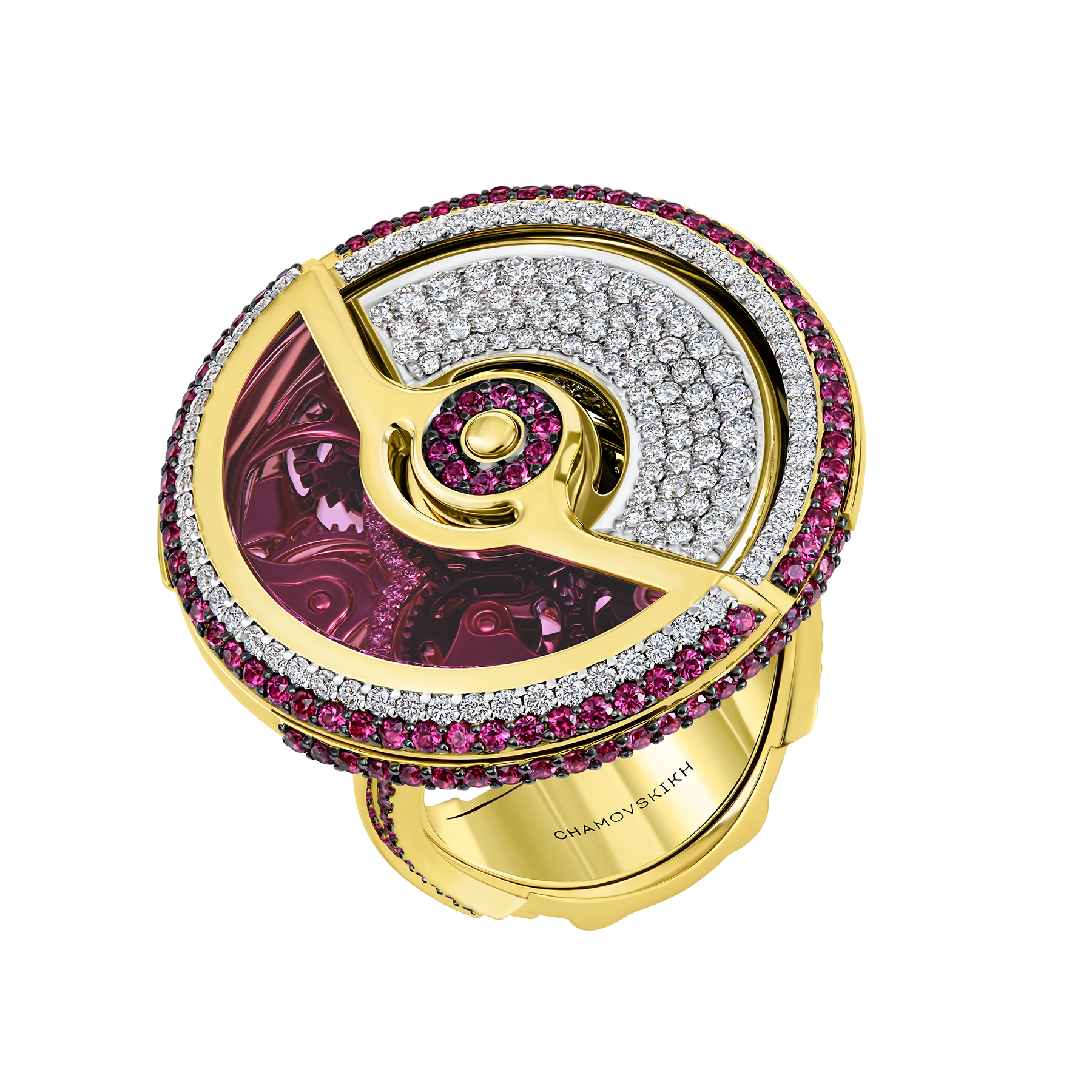 Кольцо из желтого золота, инкрустированное 218 бриллиантами и 205 рубинами превосходных характеристик. Стилизованный «заводной элемент» на торцевой части украшения приводит в движение пять шестеренок. Они, в свою очередь, сдвигают шторку, открывающую механизм кольца и пластину из контрастного корунда. Украшению присвоен идентификационный номер, гарантирующий принадлежность к лимитированной серии.