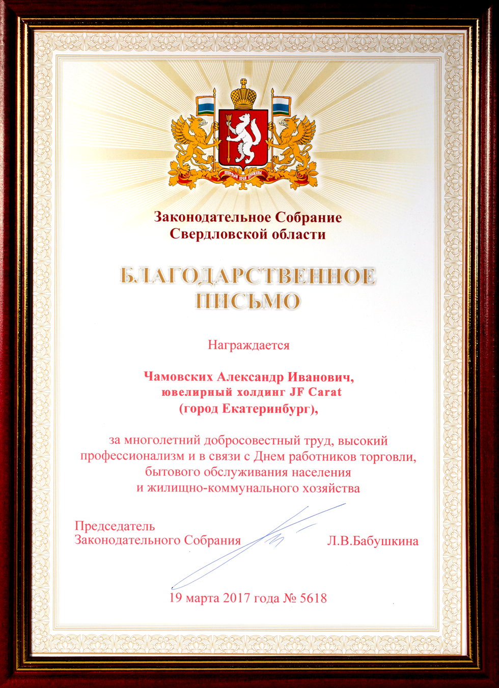 Alexander Chamovskikh, owner of CHAMOVSKIKH MAGNIFIQUE Jewelry Holding and Chairman of the Jewelers Guild of the Urals, was awarded a Letter of Appreciation from the Sverdlovsk Legislative Assembly.