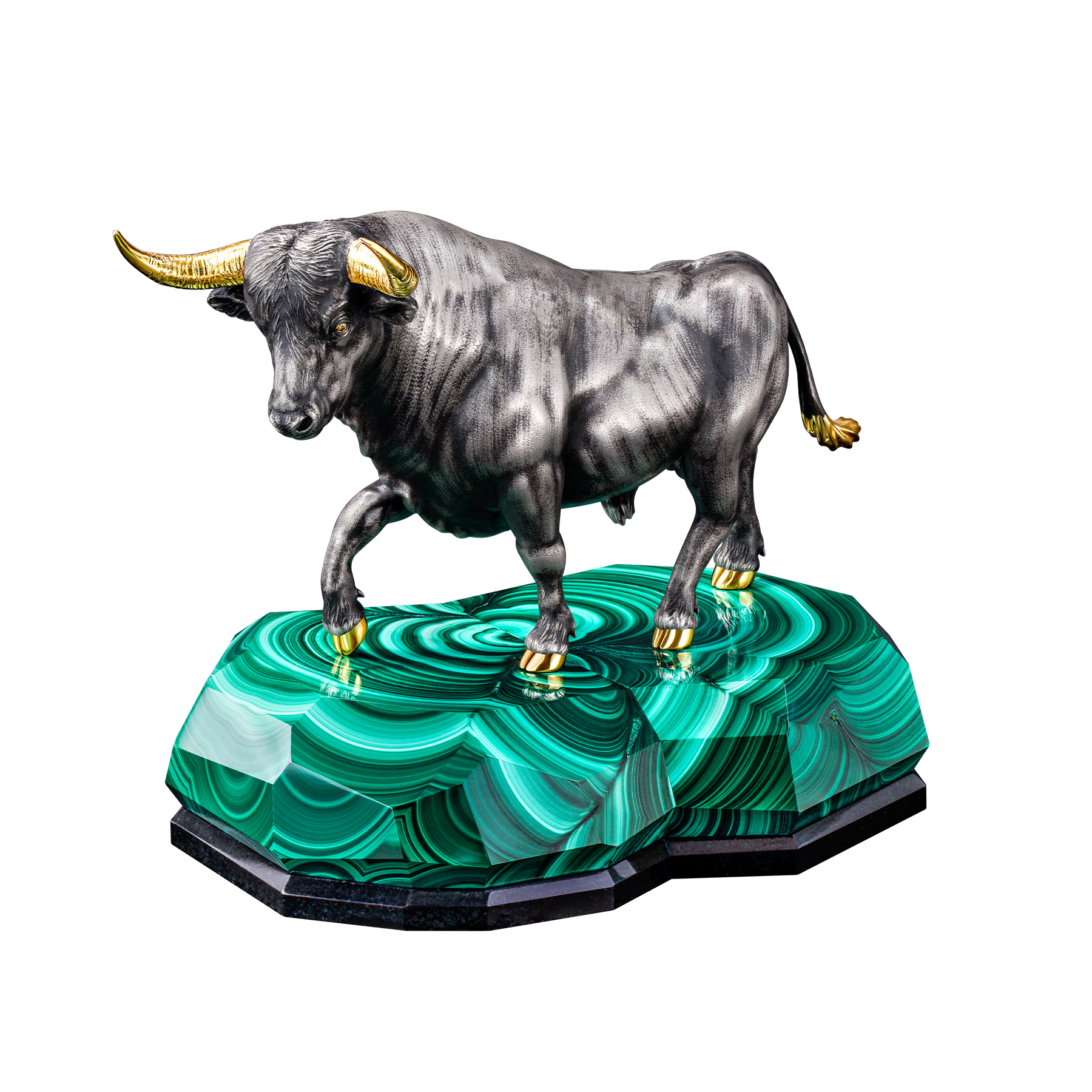 The matte figure of the Bull sculpture, cast from the finest-grade silver, reproduces the animal’s silhouette with anatomical accuracy, while vivid details in the form of gilded horns and hooves emphasize its power. The commanding pose and a precious detail—diamond eyes—embody the animal’s key qualities and strikingly complete its emotional image. The bull figure is mounted on a pedestal of malachite and dolerite.