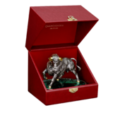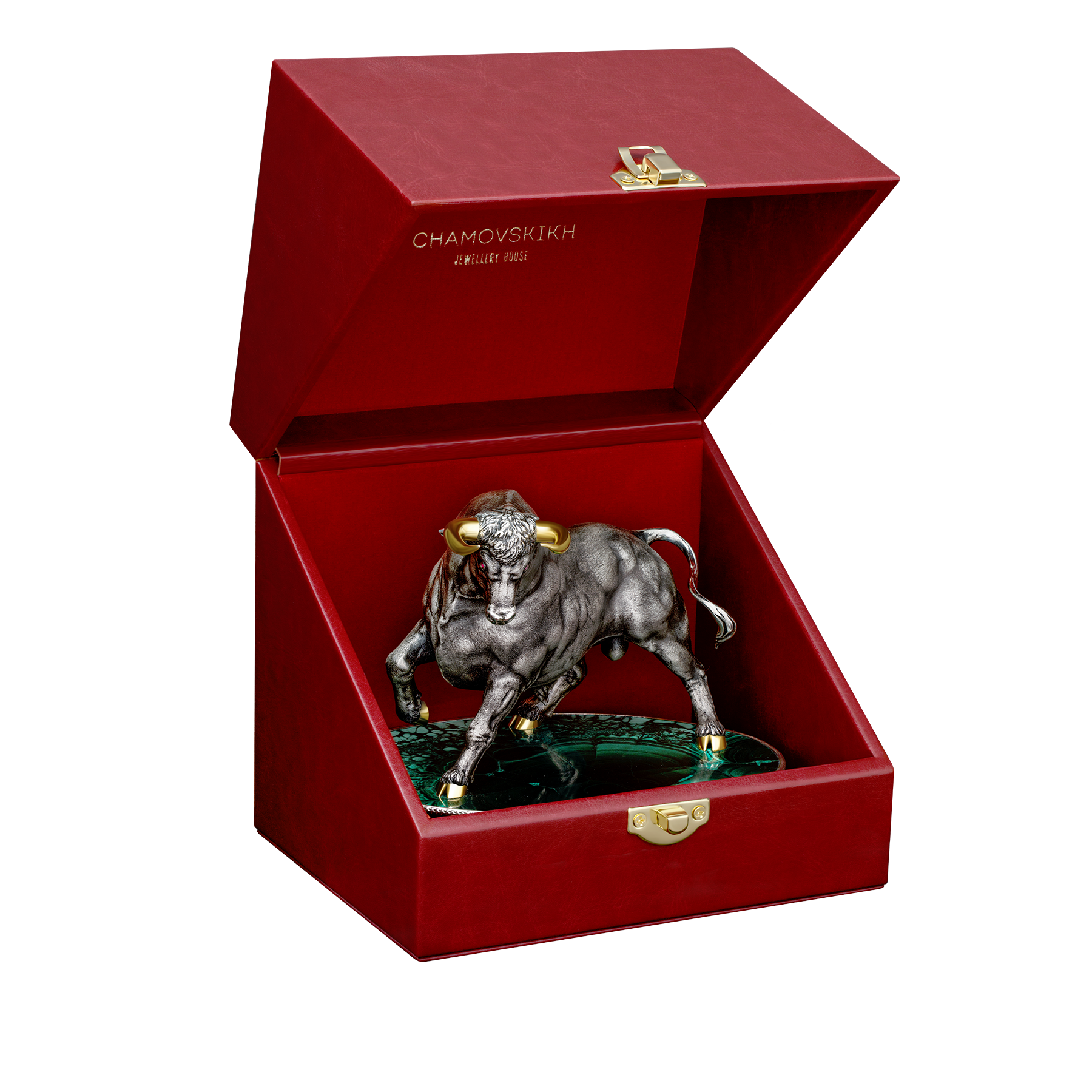 Мастера CHAMOVSKIKH проработали каждую деталь фигуры быка с точки зрения эмоций, цвета и точности изгибов. Матовая миниатюра, отлитая из серебра высшей пробы, воспроизводит естественный силуэт животного, а позолота на рогах и копытах подчеркивает его мощь. Повелительная поза и драгоценный акцент — рубиновые глаза — эффектно завершают могущественный образ.