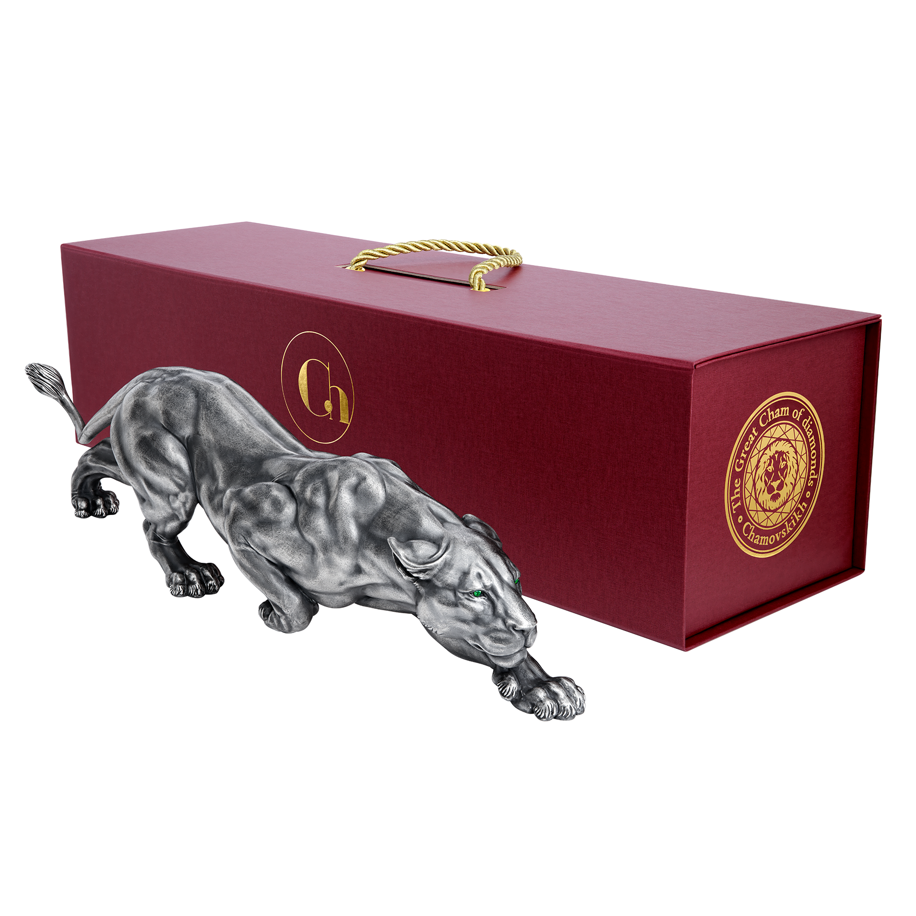 Скульптура выполнена из серебра 925 пробы. Выразительные глаза, инкрустированные (по выбору заказчика) изумрудами, желтыми сапфирами, демантоидами, цитринами или хризолитами, завершают величественный образ.